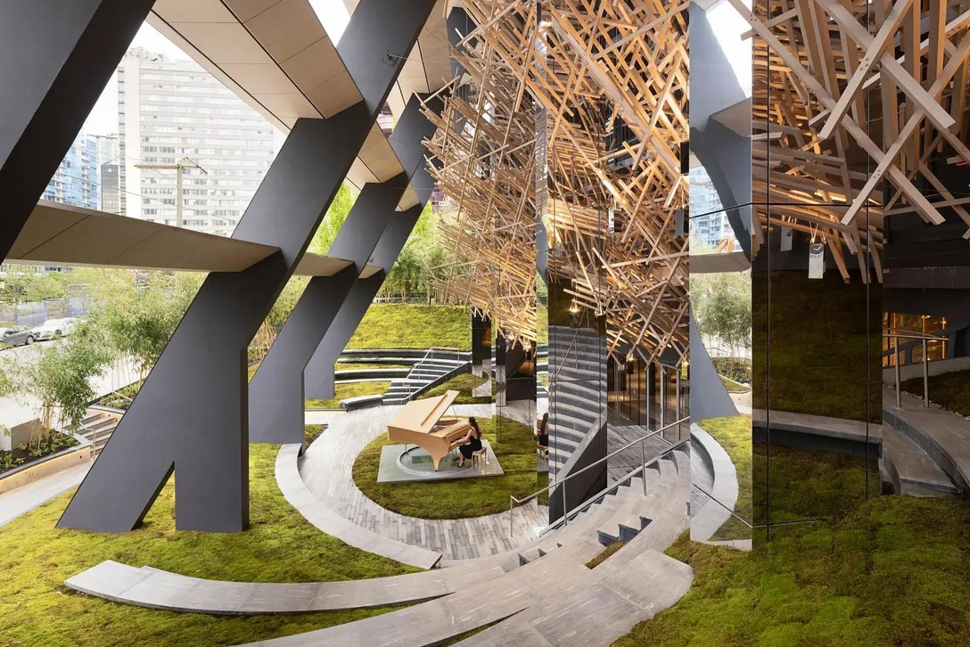 Структурные балки, идущие по фасаду, простираются над входом и создают замкнутое пространство амфитеатра, где создан сад из японского мха и пространство для выступлений. Здесь же стоит авторское пианино Fazioli, спроектированное Кенго Кумой. Оно изготовлено из многослойных листов дерева хиноки и ждет концертов под открытым небом. В это пространство также включена недавно высаженная бамбуковая роща, созданная для защиты сада и входа в здание.