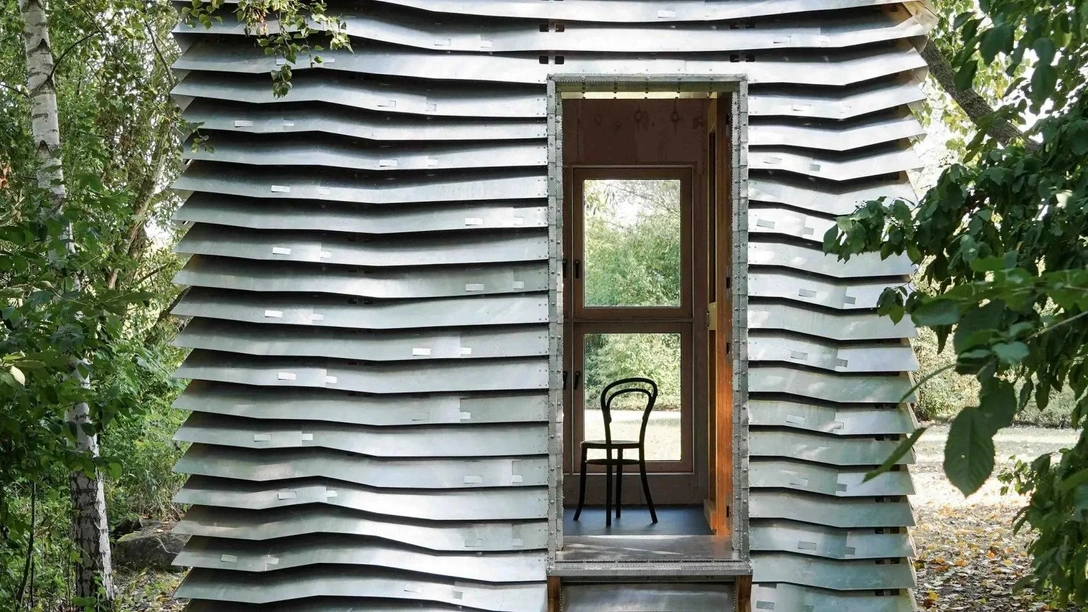 Основной строительный материал — панели из фанеры толщиной 24 миллиметра, фрезерованной на станке с ЧПУ. Фанеру дизайнеры Юлиан Крюгер (Julian Krüger) и Бенджамин Кемпер (Benjamin Kemper) закрыли фасадом из волнистых горизонтальных полос алюминия.