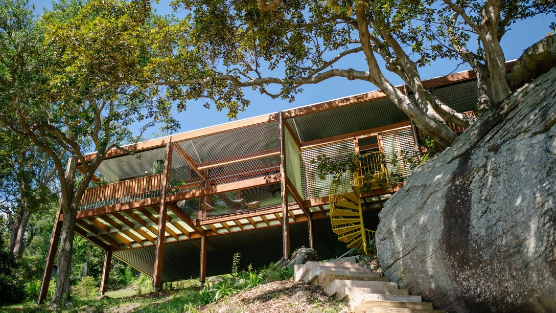 В своем проекте Balmy Palmy House архитекторы бюро CplusC воспевают неспешную жизнь на природе и призывают насладиться покоем под сенью деревьев. Причем, порой, в прямом смысле этого слова: часть стен здесь — сетка. Дом расположен в сиднейском районе Палм-Бич и стоит на скалистом берегу, его задача — создать для хозяев все условия для отдыха на природе, где они могли бы восстановить силы и «перезарядиться» под шелест листвы и пение птиц, сбежав от шума и суеты мегаполиса.