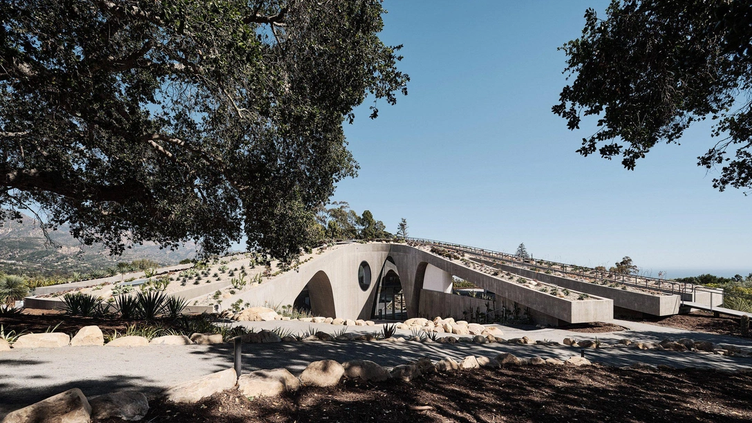 На разработку этого необычного проекта у архитекторов ушло семь лет. В итоге у них получилась бетонная конструкция из стекла и бетона площадью 1300 кв. метров, часть которой находится как бы внутри холма (отсюда и название — Hill House). Она находится на участке площадью 1,6 га между горами Санта-Инес и Тихим Океаном, недалеко от Санта-Барбары.