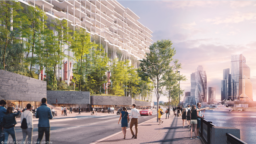 И в заключении, прямо под «парящими» зданиями появится новое общественное пространство с открытым доступом для всех жителей Москвы — прогулочная территория и благоустроенный современный парк, включающий пространство прилегающей набережной.