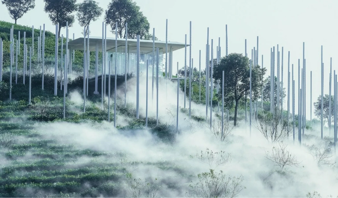 Главной идеей было растворить домик в окружающей среде и свести к минимуму физическое присутствие конструкции, дизайнеры стремились создать ощущение связи между чайной комнатой, ее природным окружением и посетителями. В композицию домика и участка вокруг него входит 170 стальных опор, которые поддерживают чайную комнату и ландшафтную инсталляцию, образуя путь между чайными полями и холмом. Из этих стальных столбов время от времени выпускают густой пар, и склон окутывает туман, словно все плывет в облаках. Эта паровая инсталляция усиливает впечатление посетителей, проходящих по дорожке на склоне в сторону чайного домика.