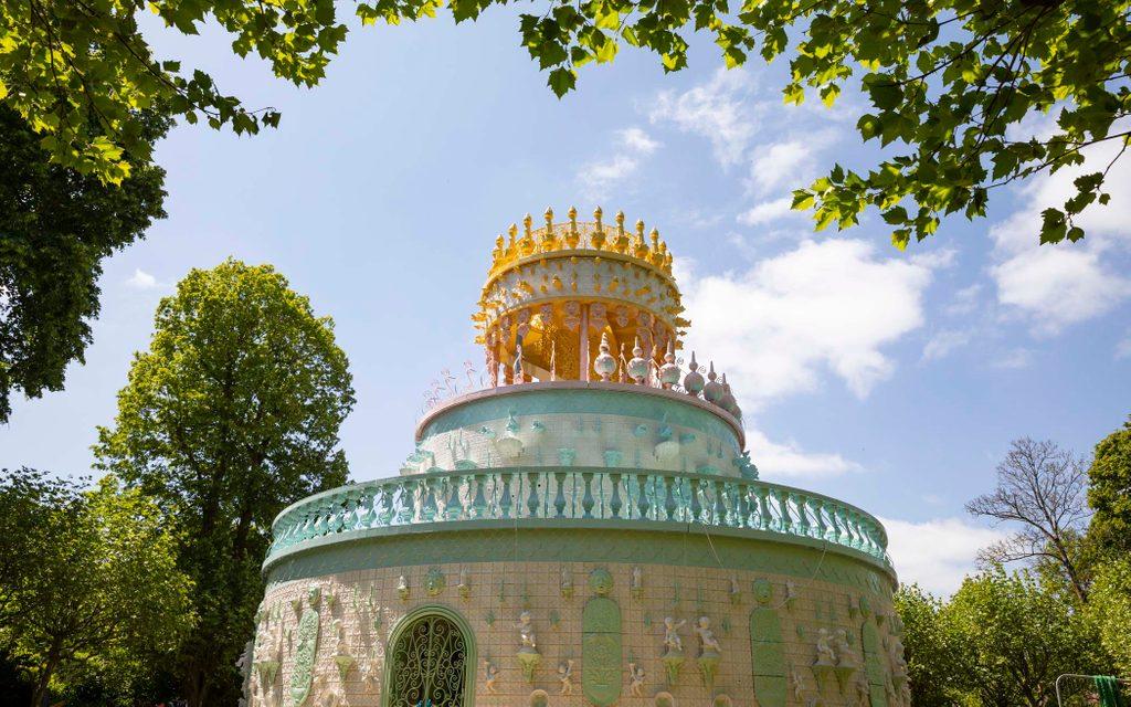 Гигантский торт приносит не только визуальные впечатления, но и сенсорный опыт — бледно-розовые, бледно-зеленые и голубые тона керамических деталей, имитирующих сливочный крем, дополняют звуки журчащей воды и специальная подсветка. Художница говорит, что создавала его как храм любви — высокой и сладкой.