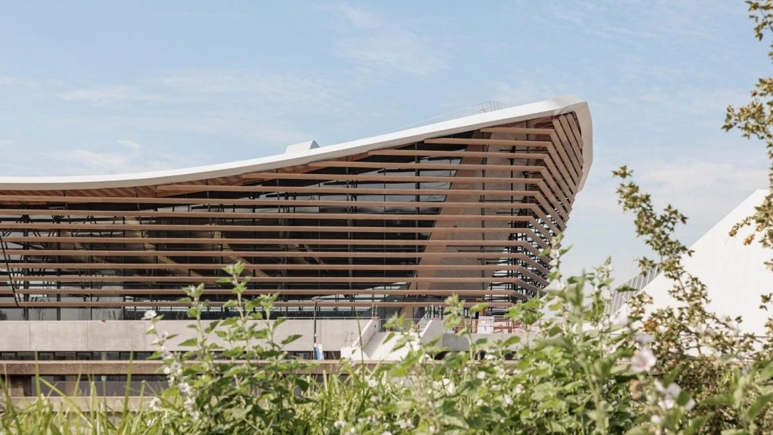 Команда архитекторов ограничила использование стали, производство которой сильно загрязняет окружающую среду, в пользу более экологичных ели и пихты из Финляндии и Франции. Исследователи обнаружили, что древесина сохраняет углерод даже после того, как ее заготовили. Крыша с деревянными балками фильтрует свет, собирает дождевую воду и улавливает энергию благодаря покрывающим ее солнечными панелями, а ее форма помогает минимизировать затраты на электроэнергию и обеспечивает оптимальную акустику.