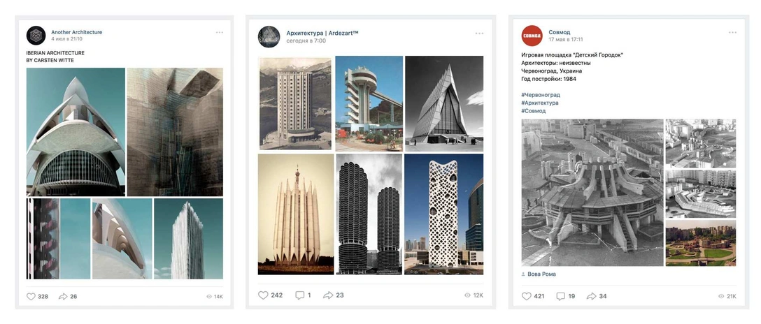 Больше 240 тысяч человек следят за обновлениями этого паблика. Несколько раз в сутки здесь публикуются фотографии и рисунки новой архитектуры и исторических построек. Также в паблике собран большой архив проектов знаменитых мировых архитекторов.
