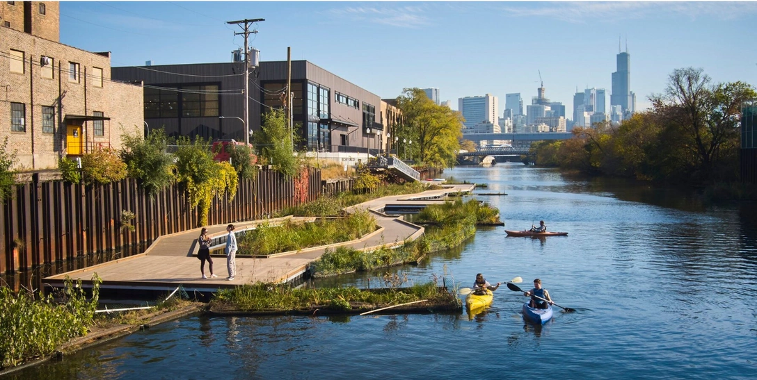 Промышленные районы Чикаго не первый год пребывают в упадке, и местные власти решили исправить ситуацию, вдохнув жизнь в кварталы рядом с бывшими заводами. Одним из главных городских проектов стал эко-парк Wild Mile, который строят прямо на воде. Компания Skidmore, Owings & Merrill (SOM) вместе с Urban Rivers запустили первую часть парка площадью 139 м2 — прогулочный блок из деревянных дорожек, клумб и посадок. Плавучий парк помогает восстановить местную экосистему, возвращает природу в промышленно развитый район, и служит общественным пространством, где можно отдыхать и гулять вдоль набережной.