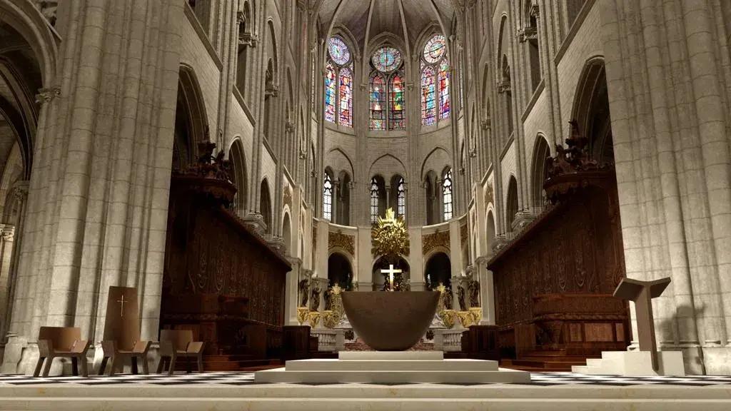 Реконструкция включала в себя воссоздание шпиля по проекту французского архитектора Эжена Виолле-ле-Дюка (Eugène Emmanuel Viollet-le-Duc), автора исторического шпиля первой половины XIX века, и разработку нового внутреннего убранства. Эту задачу архиепископ Парижский, монсеньор Лоран Ульрих (Laurent Bernard Marie Ulrich), посоветовавшись с художественным советом, возложил на французского дизайнера Гийома Барде (Guillaume Barde), которому предстояло создать алтарь, амвон, кафедру с сиденьями, скинию и баптистерий так, чтобы они были не только прочными и совершенными по форме, но несли в себе нечто большее, связанное с верой и красотой литургической жизни.