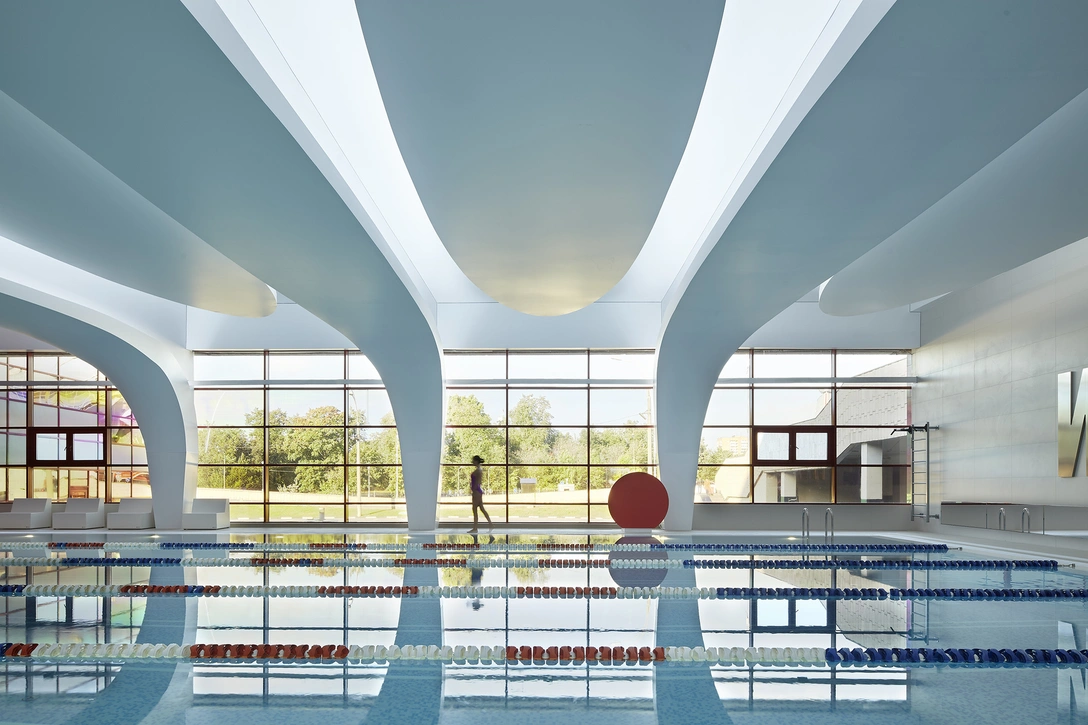 Реконструкция была выполнена всего за два месяца. Архитектурные формы переосмыслены в духе футуризма: балки получили пластическую выразительность и обрели четкие формы. Бассейн разделен на две части: входная группа с нависающим потолком оформлена в насыщенной красной палитре, а открытая плавательная зона реализована с плавными формами и доминирующим белым оттенком. Пространство наполнилось светом, за счет чего визуально стало казаться больше.