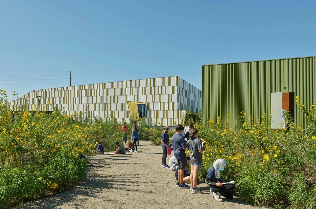 В западной части кампуса находится научно-производственное здание Wheels, которое связывает школу с близлежащей городской площадью. Навес над главным входом, выходящим на главную улицу, служит «визитной карточкой» кампуса и одновременно помещением для велосипедной стоянки и мастерской. «Большой центральный коридор расширяется, чтобы разместить пространства для совместной работы студентов и учебные аудитории, которые освещаются дневным светом в течение всего года», — рассказывают архитекторы