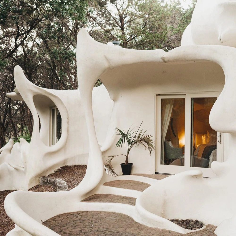 Для создания необычного дома понадобились необычные техники: на конструкцию-основу из стальных стержней наносили полиуретановую пену, которую затем формировали с помощью ручной пилы, а сверху наслаивали штукатурку. Органические изогнутые формы строения вдохновлены движением ветра и волн и гипнотическим танцем пламени.