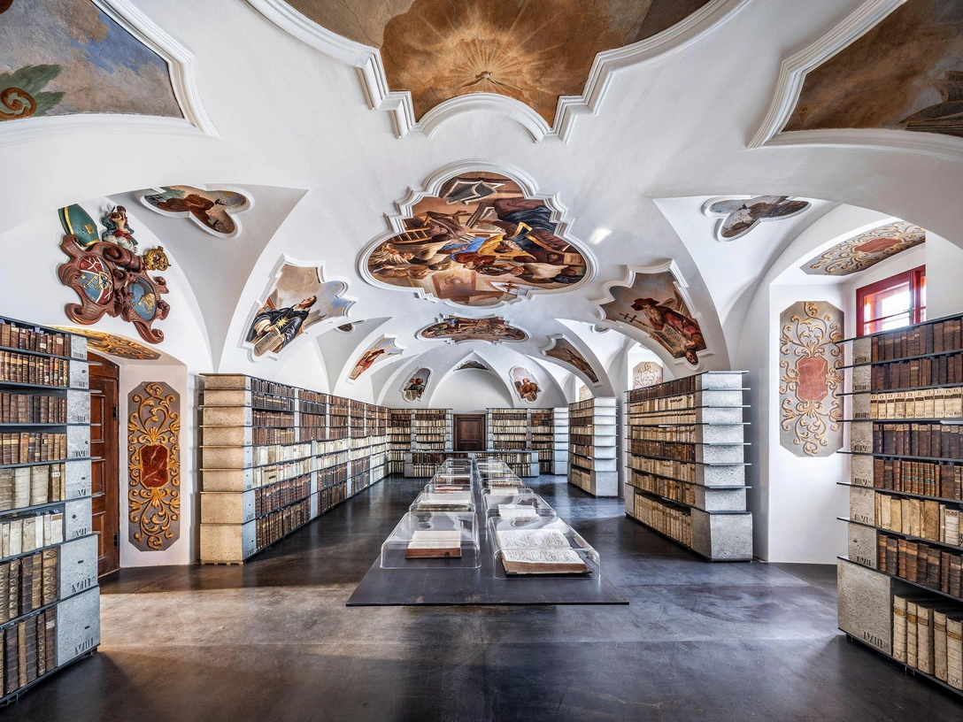 Архитекторы решили пойти не самым традиционным путем: вместо копий старых шкафов разработали современную систему, которая на удивление гармонично дополняет историческое пространство. Конструкции спроектированы так, чтобы вместить всю коллекцию ценных книг, не загораживая при этом старинные своды и красочные фрески.