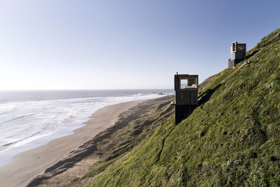 Необычные деревянные постройки стоят прямо на крутом склоне, чтобы хозяевам было близко ходить с доской до пляжа. Они представляют собой узкие трехэтажные конструкции площадью 20 и 25 кв. метров, состоящие из как будто бы поставленных друг на друга деревянных объемов. Дома соединяет деревянная лестница. Внутри объемы также соединены лестницами. Внизу находится сарай, на первом этаже — гостиная, небольшая кухня и ванная комната, а на самом верху — спальня.