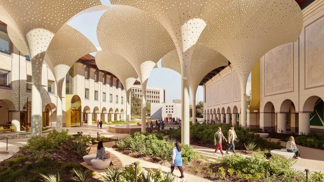 Каждый «лепесток» сделан из перфорированных панелей, которые создают тень. Одновременно они отводят дождевую воду, фильтруя ее и обеспечивая пассивное орошение. Их плавные очертания, вдохновленные арочными сводами лоджии музея, гармонично дополняют виды на Остин и Капитолий Эллсворта Келли.