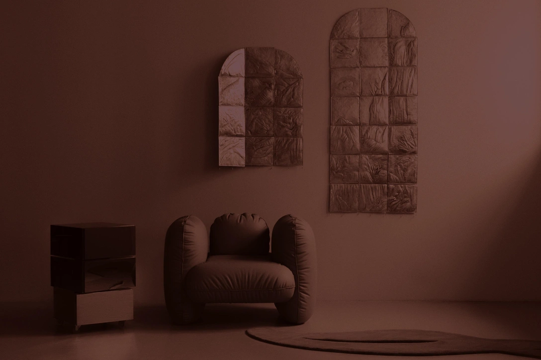 Форма ковра авторства Кати Пятицкой, напоминает крылья морской чайки. Сюжет панно, который создала в чеканной технике Александра Лапаева, рассказывает об обретении покоя среди южной природы, а орнамент на текстиле внутри ящиков комода от DA product и RO product демонстрирует три стадии созревания урожая.