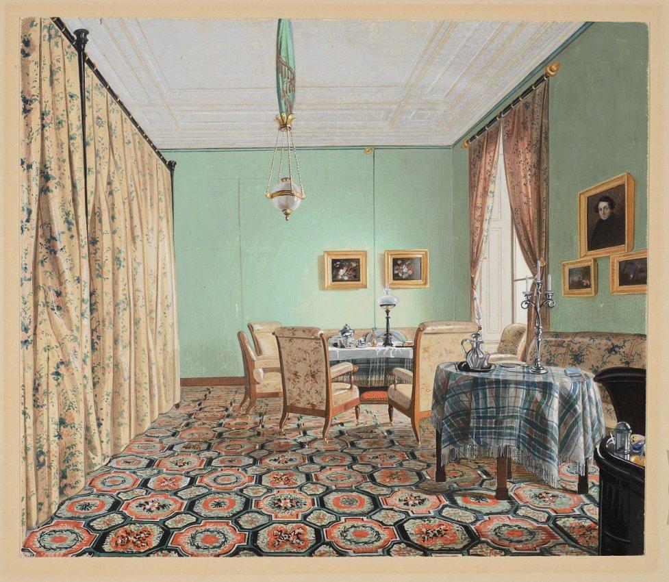 Интерьерная тема появилась в русском искусстве на рубеже XVIII–XIX вв., но наиболее широкое распространение она получила во второй четверти XIX столетия, главным образом в живописи, в работах учеников А.Г. Венецианова: К.А. Зеленцова, А.А. Алексеева, А.В. Тыранова и других. Написанные ими виды гостиных, кабинетов, мастерских художников, учебных и детских комнат в настоящее время стали важными иконографическими документами эпохи, позволяющими не только воссоздать бытовую среду, но и проследить, как смена архитектурных стилей влияла на внутреннее убранство дома.