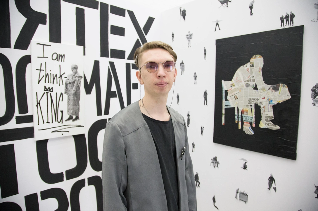 У меня была серия уличных работ, называлась «Двери говорят»: я писал мелом на обычных подъездных дверях всякие надписи (вроде: «Работает с 6 до 9», «Вход по QR-коду»…). И вот для последней своей персональной выставки «Текст как ландшафт», которая недавно завершилась в Pop/off/art gallery, я тоже сделал дверь — с текстом: «Кто там?». Рядом стояла приступочка, на нее нужно было встать, посмотреть в глазок и увидеть там изображение толпы людей со словами: «Это все мы!». В городской среде такая работа, скорее всего, быстро сломается, а в пространстве галереи ей уютнее.