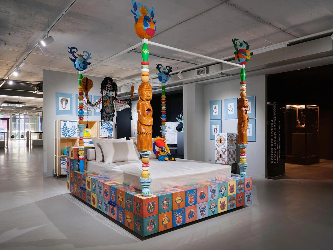 Центр выставочного зала заняла кровать с тотемами, которые вырезал из дерева один из учеников, а у стен расположились комоды, стеллаж и прикроватные тумбы, облицованные керамикой. Дополняют экспозицию текстильные арт-объекты в виде русалок, сшитые по рисункам учеников из остатков текстиля, и сами эскизы, по которым была сделана коллекция.