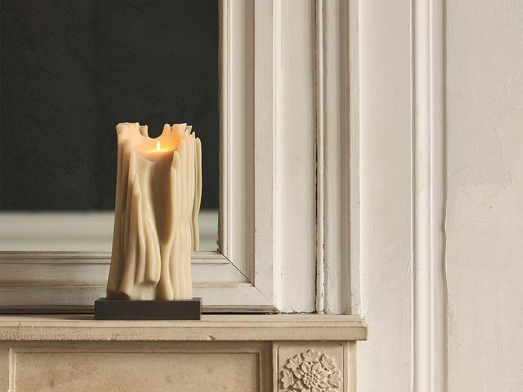 Свеча изготовлена из органического воска и установлена на латунной патинированной подставке, вырезанной по форме свечи. У нее нет аромата, что подчеркивает идею естественности, а в ее форме выражена природная красота.