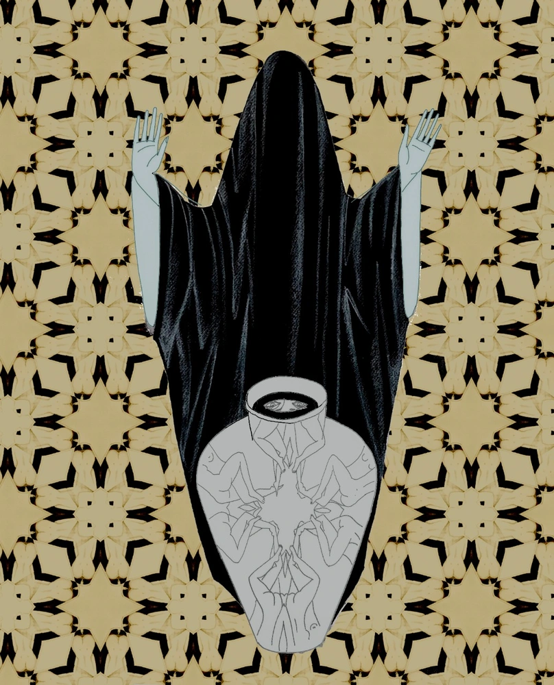 С помощью генеративного программного обеспечения, позволившего упорядочить выбранные детали ее рисунков, Айдан создала паттерны, которые заполнили весь фон, и наложила на него сюжет. Здесь, как и в процессе создания шелкографий, работает симбиоз человека и машины.