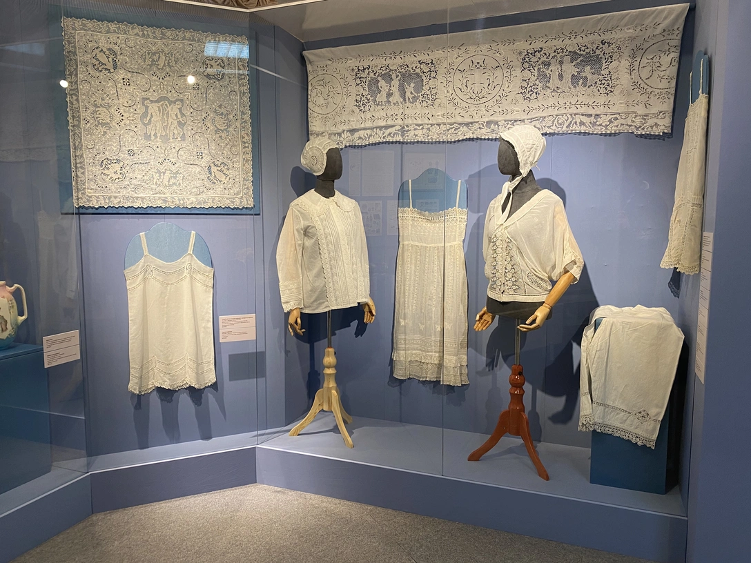 Специалисты утверждают, что редко сохраняются предметы одежды из одной семьи. Однако на выставке представлена такая коллекция — нижнее белье семьи купчихи Серафимы Поздняковой: женские и детские сорочки, нижние юбки, панталоны для приданого с сохранившейся этикеткой московского фабриканта Тимашева, а также фотографии.
