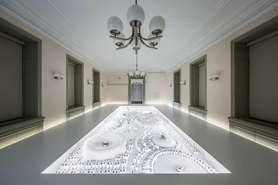 Центральное место в инсталляции занимают модели Air Max из последней коллекции 2017 года, возвышающиеся на вращающихся "подиумах". А фоном для них служат концентрические формы, собранные из белых кроссовок той же серии, но предыдущих версий. Главная идея инсталляции - показать "генеалогию" Air Max и эволюцию их дизайна от ранних моделей до наших дней.