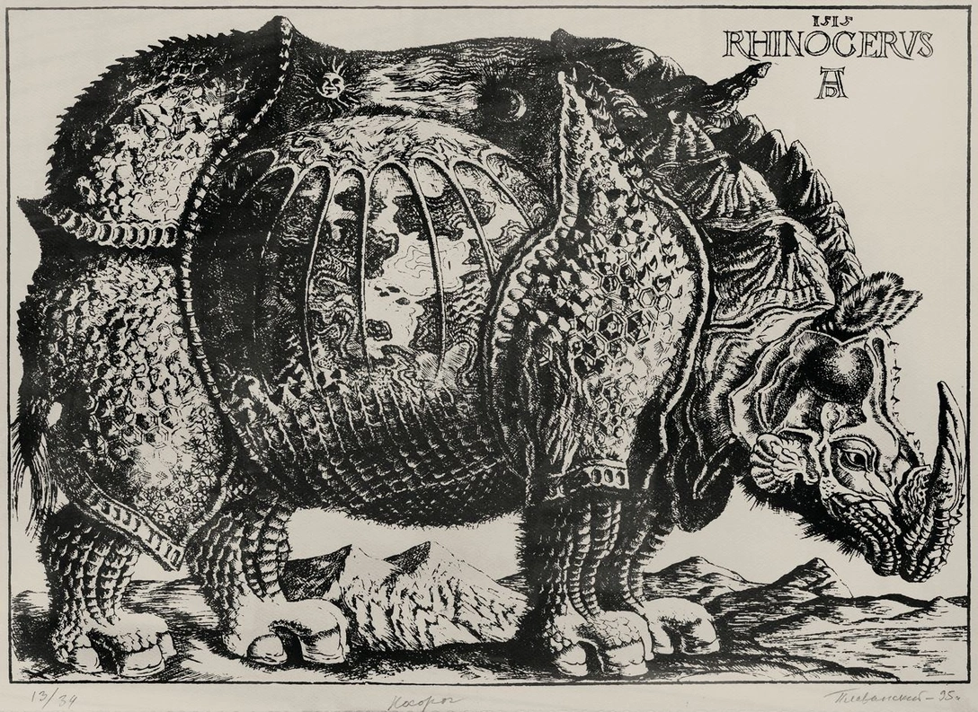 Анималистические символы черепах и носорогов для Плавинского не случайны. Черепахи олицетворяют в творчестве художника синтез русской, древнегреческой и китайской культур. Изображения носорога являют собой диалог художника с Альбрехтом Дюрером. С подлинником «Носорога» мастера Северного Возрождения Дмитрию Плавинскому довелось познакомиться в студенческие годы в гравюрном кабинете ГМИИ им. Пушкина.