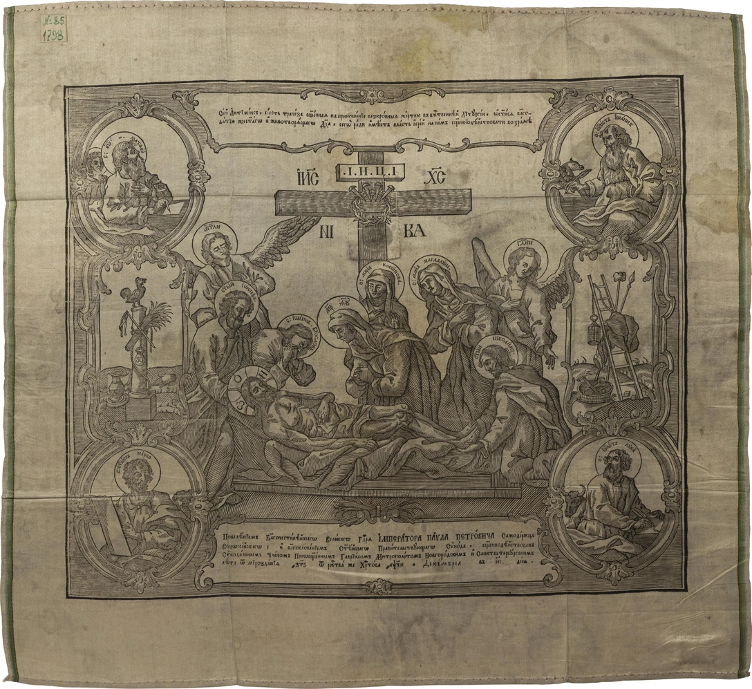 Антиминс «Положение во гроб», 1752 г. (1745 г., копия «Большого» антиминса И. Ф. Зубова). Церковь Всемилостивейшего Спаса (что в Спасской в приделе Тихвинской Богородицы). Желтый шелк, офорт, резец, чернила, перо.