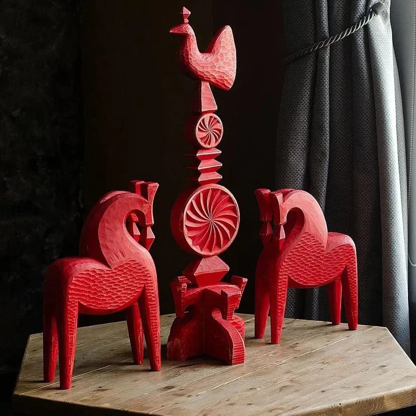 Художник, предметный дизайнер, основатель мастерской «Русский дом» Дмитрий Чекучинов создает работы из дерева, используя различные техники резьбы: трехгранно-выемчатую, плоско-рельефную с растительным орнаментом, объемную в скульптуре. В его работах образ коня отсылает к истории и мифологии славянских народов, но также он сопряжен с объединяющей время и движение солярной символикой, важнейшей для традиционных культур.