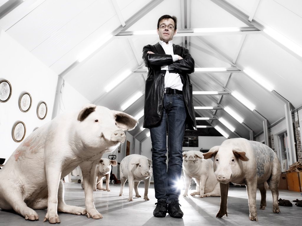 Однако, пожалуй, самая одиозная работа Вима Дельвуа — живые произведения искусства: татуированные свиньи, кожу которых художник украсил культовыми символами западной культуры вроде монограмм Louis Vuitton или диснеевских персонажей .