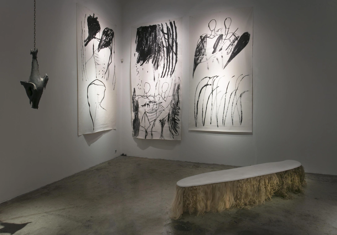 Графитный цвет чугуна, его материальная составляющая, вес, совмещаются в объектах Кати Веселовской с утонченностью скульптурной лепки. Монохромная графика Алёны Petite, которая рисует буквально на всем, что попадается под руку, сродни перформативному жесту или разрезанным холстам Лучо Фонтана. Обеих художниц куратор Петр Белый считает современными декадентами, продолжателями традиций Серебряного века, которые рассказывают историю длящегося мистического опыта жизни в Петербурге современным языком.