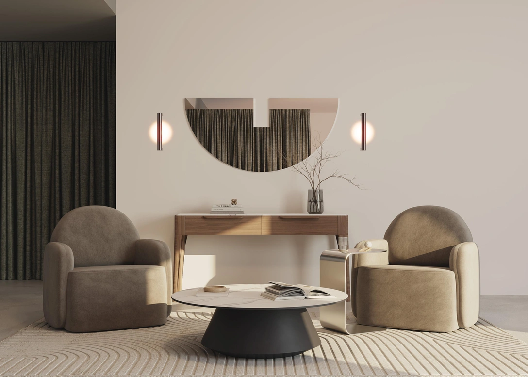 Настенный светильник Theorema отличается лаконичным дизайном. «Минимализм на максималках» — так звучала главная идея коллекции. Светильник представляет собой металлическую трубу со стеклянной линзой, расположенной с обратной стороны конструкции. Основным декоративным элементом является круг света, который линза создает на стене.