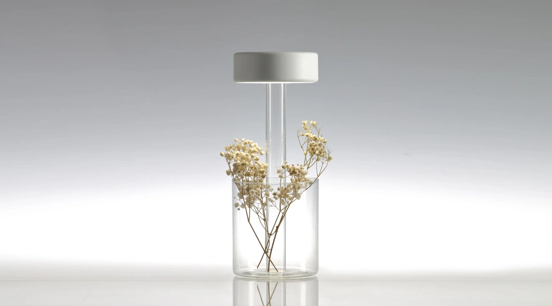 Основание настольной лампы представляет собой вазу для цветов. Ее можно украсить живым букетом, сухоцветами или использовать как флорариум для суккулентов. Сверху находится сам светильник, из которого вниз распространяется световой поток. Мощность света и цветовую температуру можно регулировать с помощью touch-выключателя. Светильник заряжается от USB-зарядки и может работать автономно.