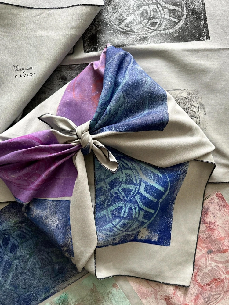 К выставке «Морской узел» в суздальском арт-пространстве «Ларец» художник Алексей Куклин создал 30 авторских «тюков» — тиражных арт-объектов, которые соединяют в себе прошлое, настоящее и личное. Каждое изделие представляет собой квадратный отрез ткани, расписанный акрилом в технике ручной печати — монотипии. На каждом из них художник повторил ту же абстрактную композицию, что и на своих холстах на выставке, но ритм конструкции и цвета не повторяются, каждый «ТЮК» — уникален и единственен в своем роде.