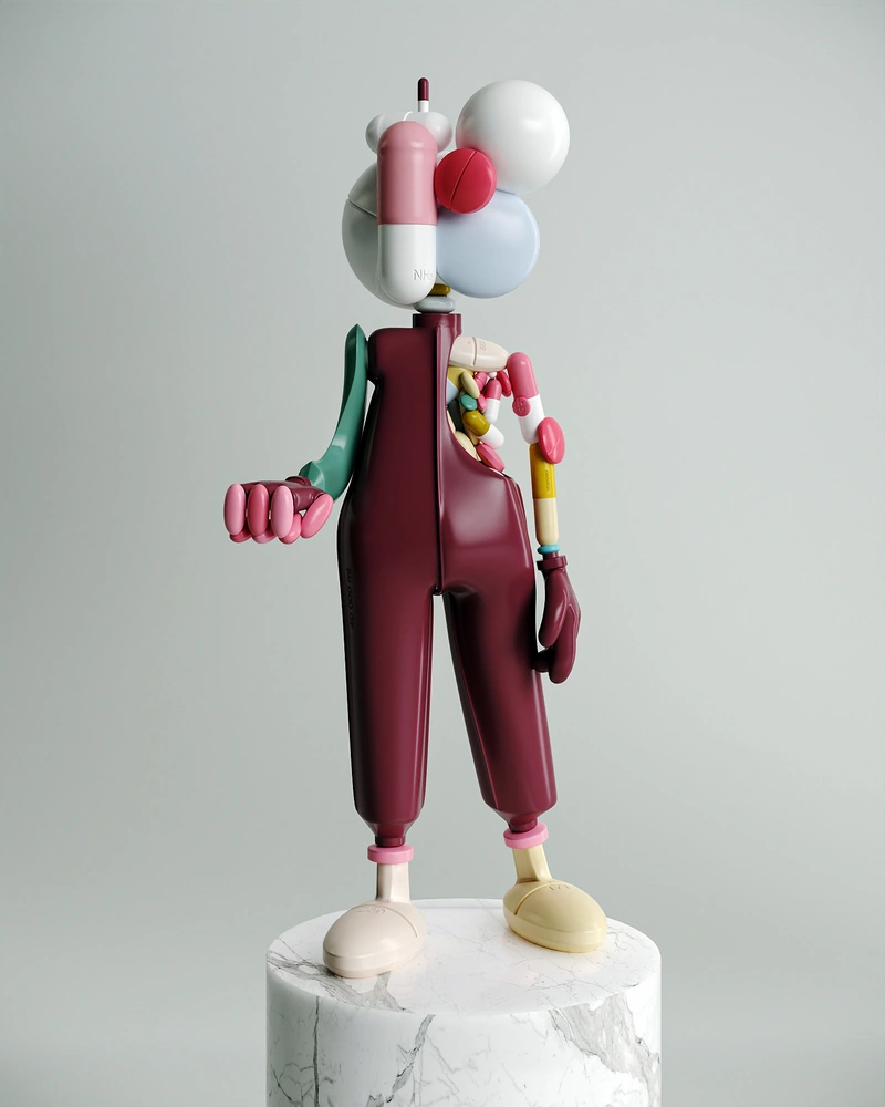 ТАРАС ЖЕЛТЫШЕВ: PillMan — это персонаж, идея которого уже давно витала в воздухе. Первая мысль о нем появилась, когда я узнал, что лекарства скоро начнут продавать в супермаркетах, как продукты. Вначале появился эскиз гормональной курицы, которая тоже полностью состояла из таблеток и витаминов. Но спустя некоторое время я решил подать эту тему весело — через знакомство с вот таким забавным персонажем.