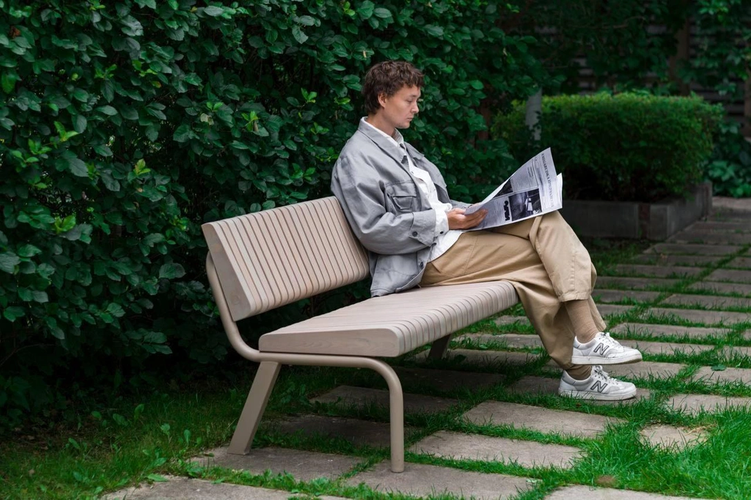 Каркас сделан из стали с цинковым покрытием для защиты от коррозии и покрыт порошковой окраской. Сидение и спинка сделаны из лиственницы камерной сушки под маслом. Прочная и долговечная вещь, которая при этом еще и отсылает к нашему дизайн-наследию — «каждому будет приятно увидеть знакомые черты и комфортные пропорции в этой скамейке», считают дизайнеры.