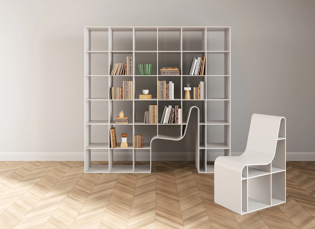 Японский архитектор Соу Фуджимото разработал оригинальную "библиотеку" для фабрики Alias. Модель Bookchair объединяет систему хранения и кресло в единое целое. Сиденье с точностью до миллиметра вписывается в нишу стеллажа, по форме точно повторяющую очертания стула. Когда кресло не используется, его можно задвинуть в корпус системы хранения. Кресло и книжный стеллаж выполнены в едином минималистичном стиле.