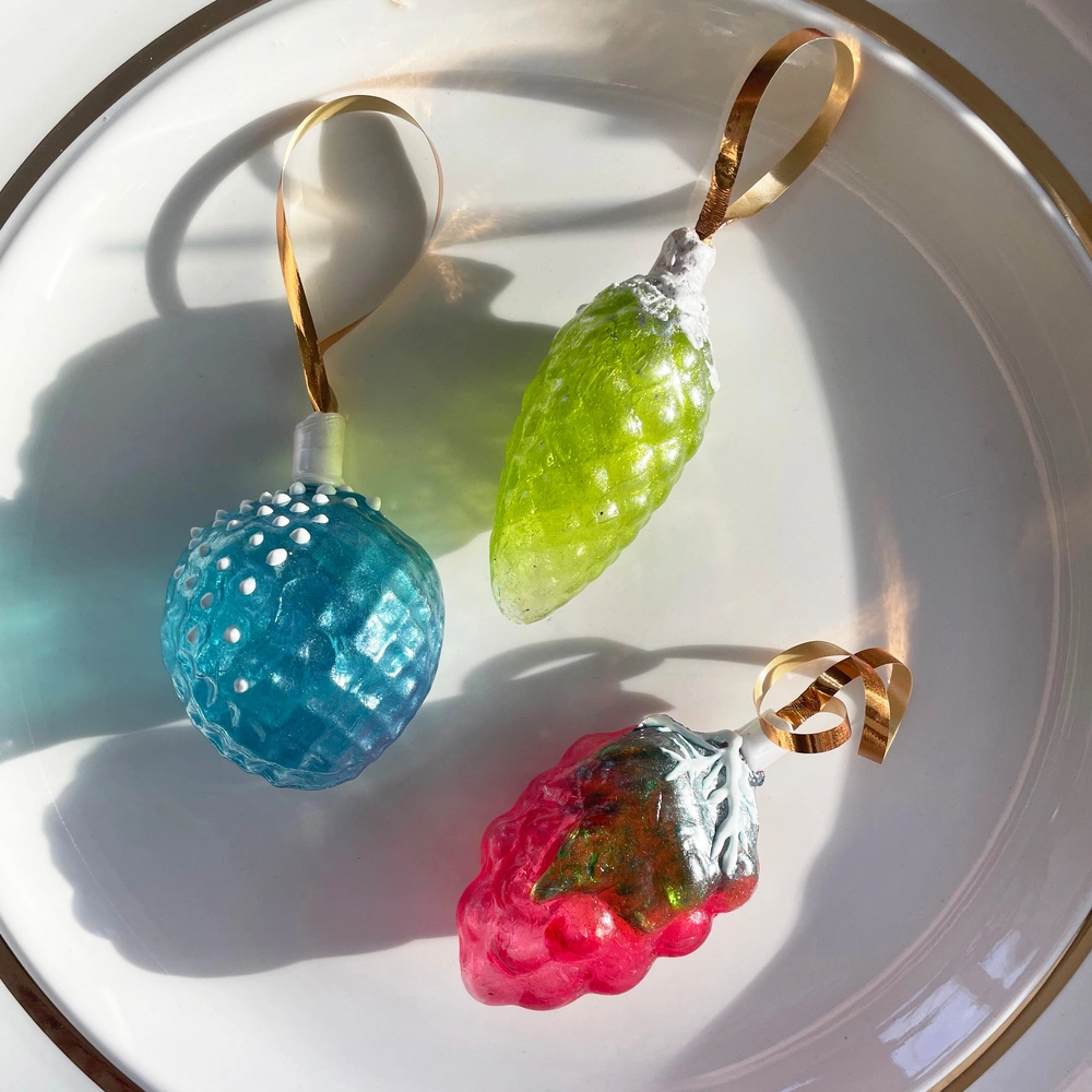 «Для создания игрушек из выдувной карамели я использовала наиболее узнаваемые формы — шишки, виноград, фонарики. А чтобы придать им новизну и современный характер, я добавила натуральные вкусы и ароматы, раскрашивая их вручную цветной яичной глазурью».