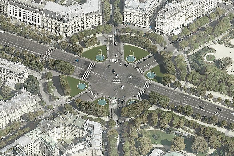 «Нашей целью было вписать фонтаны в городской ландшафт, максимально деликатно отнеститьсь к видам с проспекта в сторону площади Согласия и площади Шарля де Голля и слегка обозначить переход из тишины и покоя садов к бурной жизни Елисейских полей», — говорят дизайнеры. Древовидная геометрия фонтанов гармонирует с окружающими деревьями, а сама конструкция являет собой гармоничное сочетание монументальности и эфемерности, брутальности металла и визуальной хрупкости хрусталя.