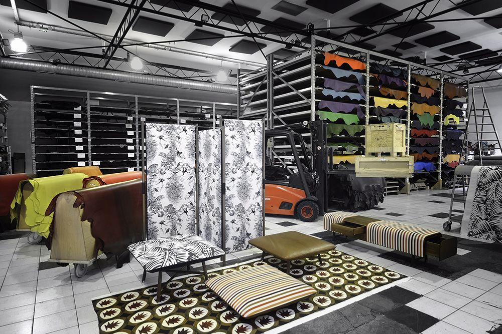 На фото: Коллекция Les Nécessaires в ателье Hermès. Здесь происходит «примерка» различных вариантов обивки. Так, часть ширмы Partition обтянута тканью Equateur. Для табуретов Carré d’assise выбрали ткани Feuillage imprimé, Ottoman и натуральную кожу. На полу — ткань Dune. Скамья с ящиком Cheval d’arçons также обита тканью Ottoman.