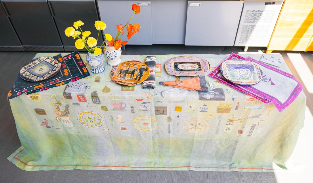 В коллекцию вошли скатерть и четыре вида плейсматов из 100% льна. Каждое изделие создано по мотивам работ Алисы. Сюжеты вдохновлены путешествиями и культурными традициями разных стран, которые художница посетила за последние годы.