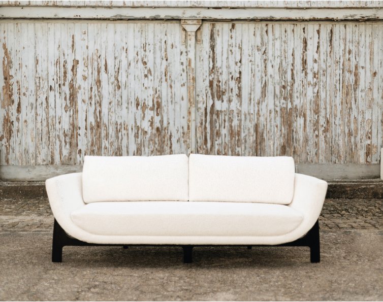 Основание дивана плавно перехдит в изгиб подлокотников и упирается в графичный деревянный каркас темного дерева. Силуэты дивана и детали конструкции вдохновлены выразительными линиями фасадов дворца Алворада в Бразилиа, спроектированного Оскаром Нимейером в конце 1950-х годов.