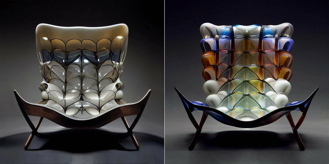 Рисовать в нейросети Midjourney — одно из самых популярных увлечений последних месяцев. Достаточно сформулировать образ в виде текстового запроса — и искуственный интеллект создаст по вашему описанию картину. Дизайнер Каве Наджафян (Kaveh Najafian) использовал ее для работы и создал вместе с Midjourney целую коллекцию сюрреалистичных кресел. Модели выглядят весьма эксцентрично: оленьи рога вместо подлокотников, изогнутые спинки, выполненные то ли из стекла, то ли из цветного пластика, и объемные словно наполненные воздухом подушки. Являясь результатом случайного слияния различных форм и материалов, они кажутся знакомыми, но в то же время странными и нереальными.