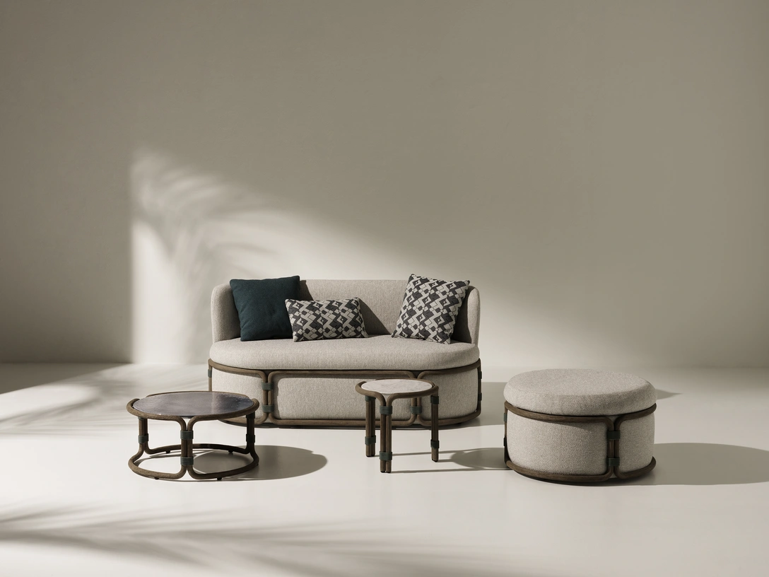 Почти все предметы из серии Rotin дополнены структурной обивкой, изготовленной из высококачественных материалов и тканей, специально предназначенных для использования на открытом воздухе. Элементы каркаса из теплого тика, соединенные жгутами, охватывают сиденья и столешницы журнальных столиков, подчеркивая их контуры.