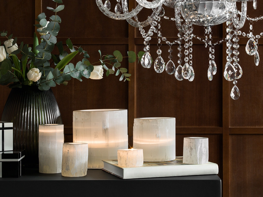 Новая коллекция подсвечников «Лоан» марки Togas сделана из селенита Это бело-желтый минерал, разновидность полупрозрачного гипса. Название происходит от греческого слова selene («Луна»), а за уникальную способность удерживать тепло его называют хранителем домашнего уюта. О сиянии небесного тела напоминает специфический оттенок и характерный слоистый состав минерала, переливы которого создают привлекательный оптический эффект лунного камня.