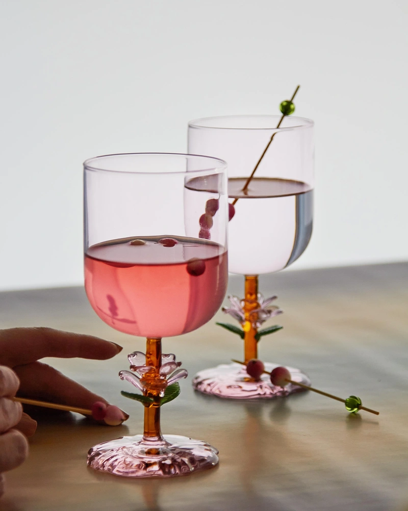 Помимо красоты новинка обладает и другими достоинствами, такими как широкая чаша, компактные размеры, устойчивости и эргономичная форма. Изделия представлены в двух расцветках: прозрачном стекле и розовом. Мыть их рекомендуется мягкими моющими средствами без использования абразивных веществ, жестких губок и ершиков, которые могут повредить цветочек на ножке.