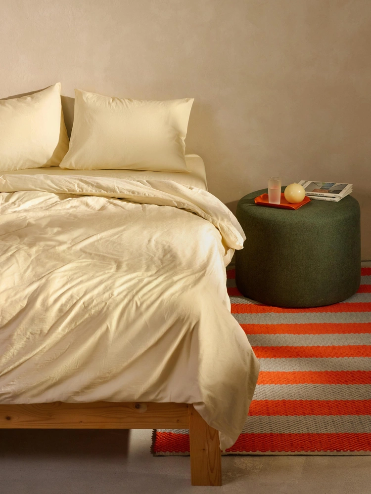И вот недавно марка представила коллекцию постельного белья из сатина. Изделия производятся в Санкт-Петербуге и доступны в четырех пастельных расцветках: лимонно-кремовой, розовой, синей и серой. Эти цвета гармонично сочетаются с мебелью бренда и разноцветными полосатыми ковриками, выпущенными брендом в коллаборации со студией авторского текстиля Walezhnik.