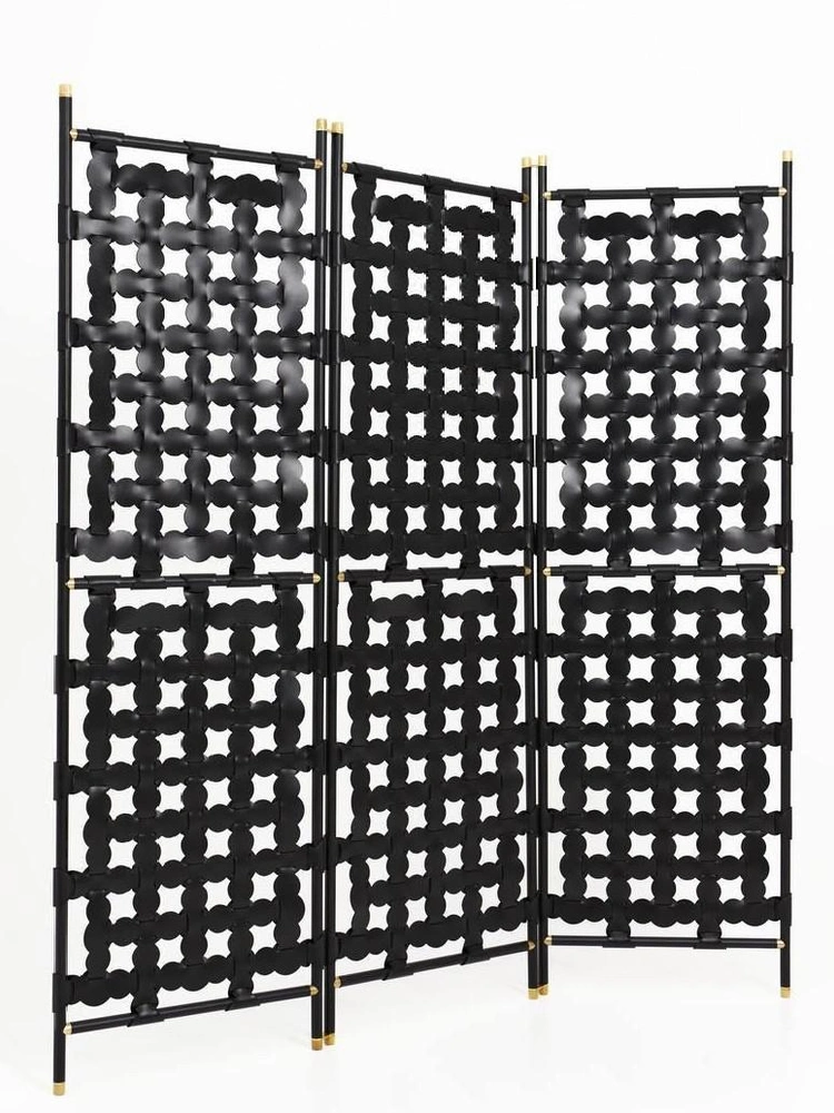 Матовый черный металл выбран дизайнером неслучайно: такая поверхность не дает лишнего блеска и не перетягивает все внимание на себя, делая кожу главным «героем», а глубокий черный цвет создает отличный фон, подчеркивающий богатство текстур. Детали из брашированной латуни придают композиции глубину и объем (а еще выступают эффектным акцентом). Кожаные ленты, из которых сплетено полотно ширмы, имеют округлую форму — это сделано специально, чтобы привнести в строгую геометрию ширмы элемент плавности и мягкости и создать эффект гармонии.