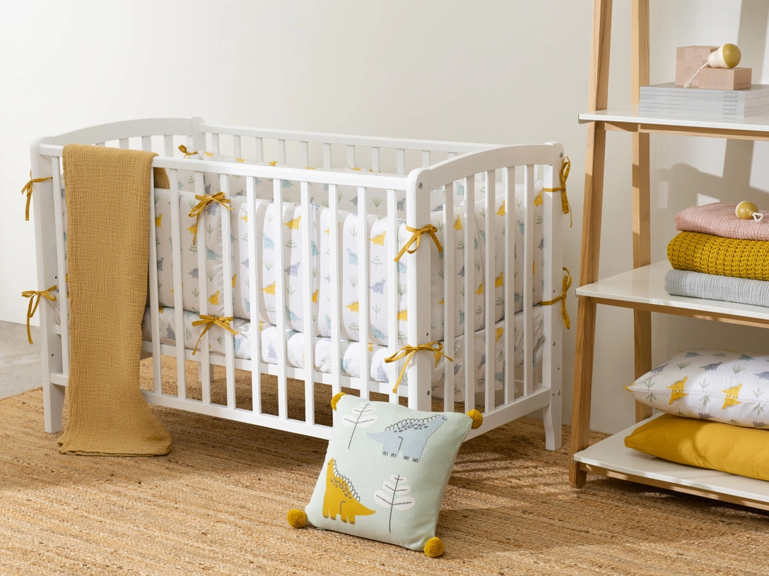 Детские постельные принадлежности Essential представлены в трех базовых цветах: светло-сером, голубом и горчичном. А Tiny world — с уже знакомыми покупателям принтами Animalia world, Oceania world и Dinosauria world со слоником Lou, ежиком Ugo и динозавром Toto. Бортики на кроватку (360х30х5) из коллекции Tiny world с принтом на обеих сторонах подойдут для обычной и для круглой кроватки-трансформера. Они состоят из 6 секций по 2 «подушечки» с завязками и сочетаются с любым постельным бельем.