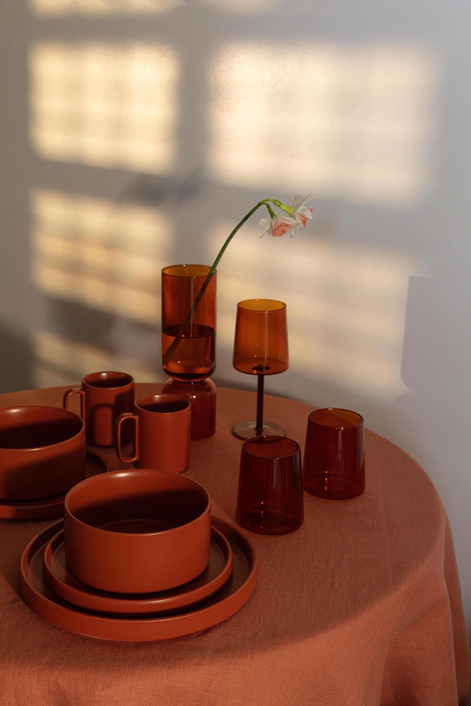 В ассортименте — столовая посуда из керамики в четырех расцветках (еловая, молочно-бежевая, терракотовая и серая), а также вазы-подсвечники, стаканы и бокалы в пяти цветах: ярко-синем, графитово-сером, бирюзово-изумрудном, янтарном и прозрачном. Нам особенно понравились изящные васильковые бокалы для вина на длинной, тонкой ножке, которые станут 100% must have праздничной и повседневной сервировки в наступающем летнем сезоне.