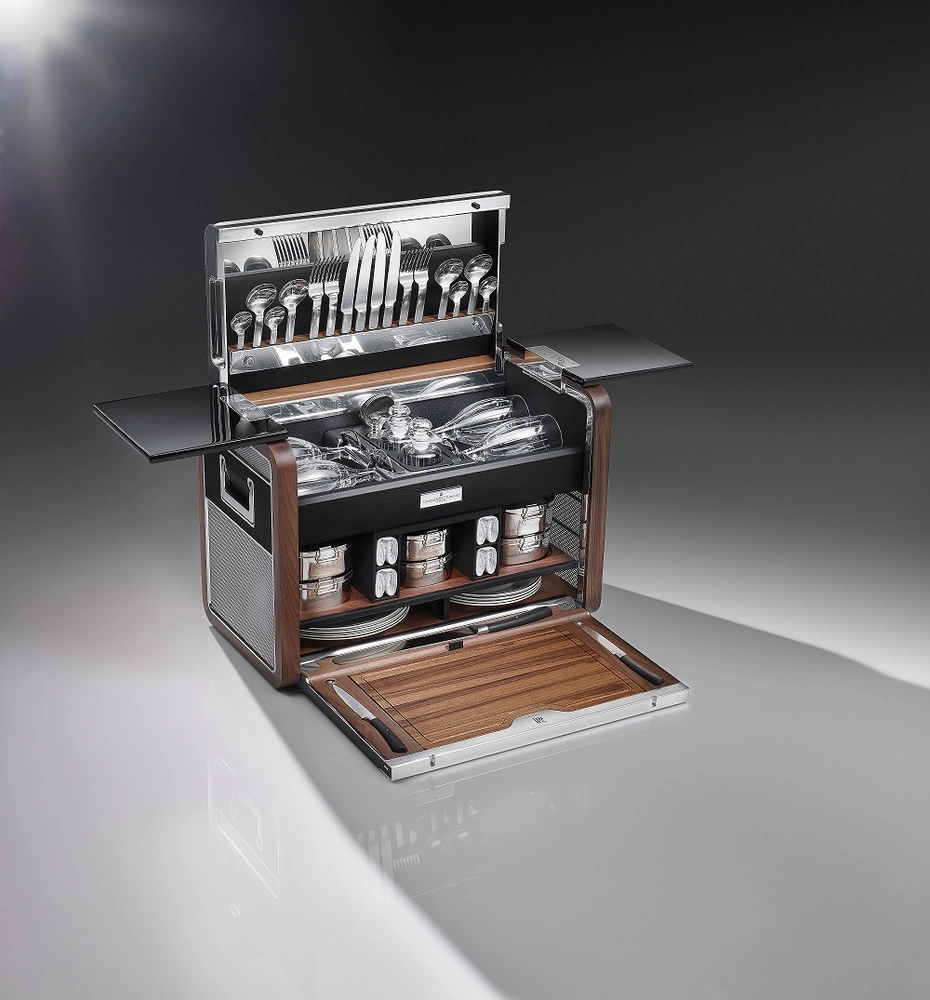 Кожаные и деревянные стеллажные отделения корзины вмещают хрустальные бокалы для вина ручной работы, столовые приборы из нержавеющей стали, белоснежные салфетки с вышитой монограммой Rolls-Royce и разделочную доску из американского каштана. Финальный штрих – уникальная посуда, украшенная черным и платиновым кантом.